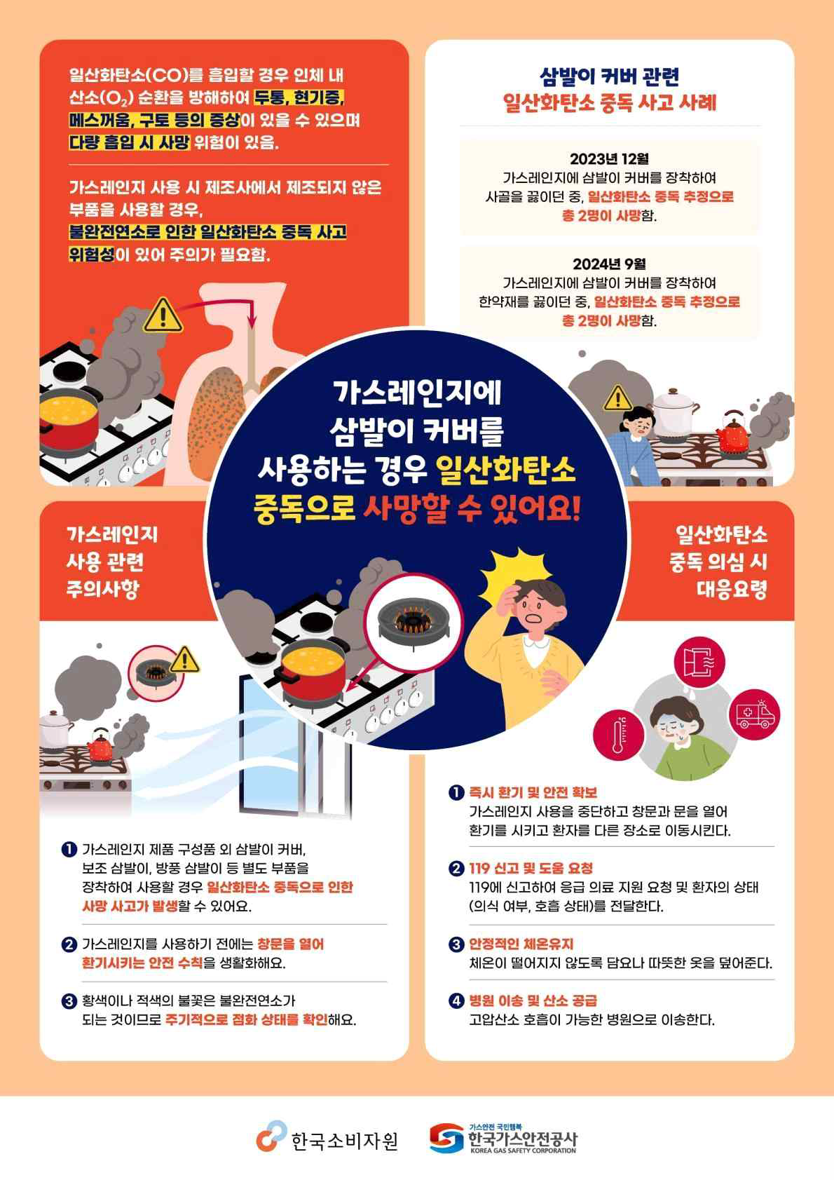 2023년 12월, 가스레인지에 삼발이 커버를 장착해 사골을 끓이던 중 2명이 일산화탄소 중독으로 추정되는 사고로 사망하였고, 2024년 9월에도 한약재를 끓이던 중 2명이 유사한 사고로 사망하였습니다 .